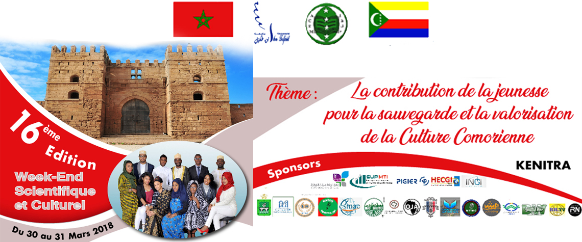 L'association des Comoriens Etudiant au Maroc (A.C.E.M) vous présente le Week end Scientifique et Culturel de l'étudiant Comorien au Maroc Le 16eme édition sous le thème " Contribution de la jeunesse pour la sauvegarde et la valorisation de la culture comorienne". Elle se déroule à Kénitra ( Maroc) du 31 Mars à 01 avril 2018.