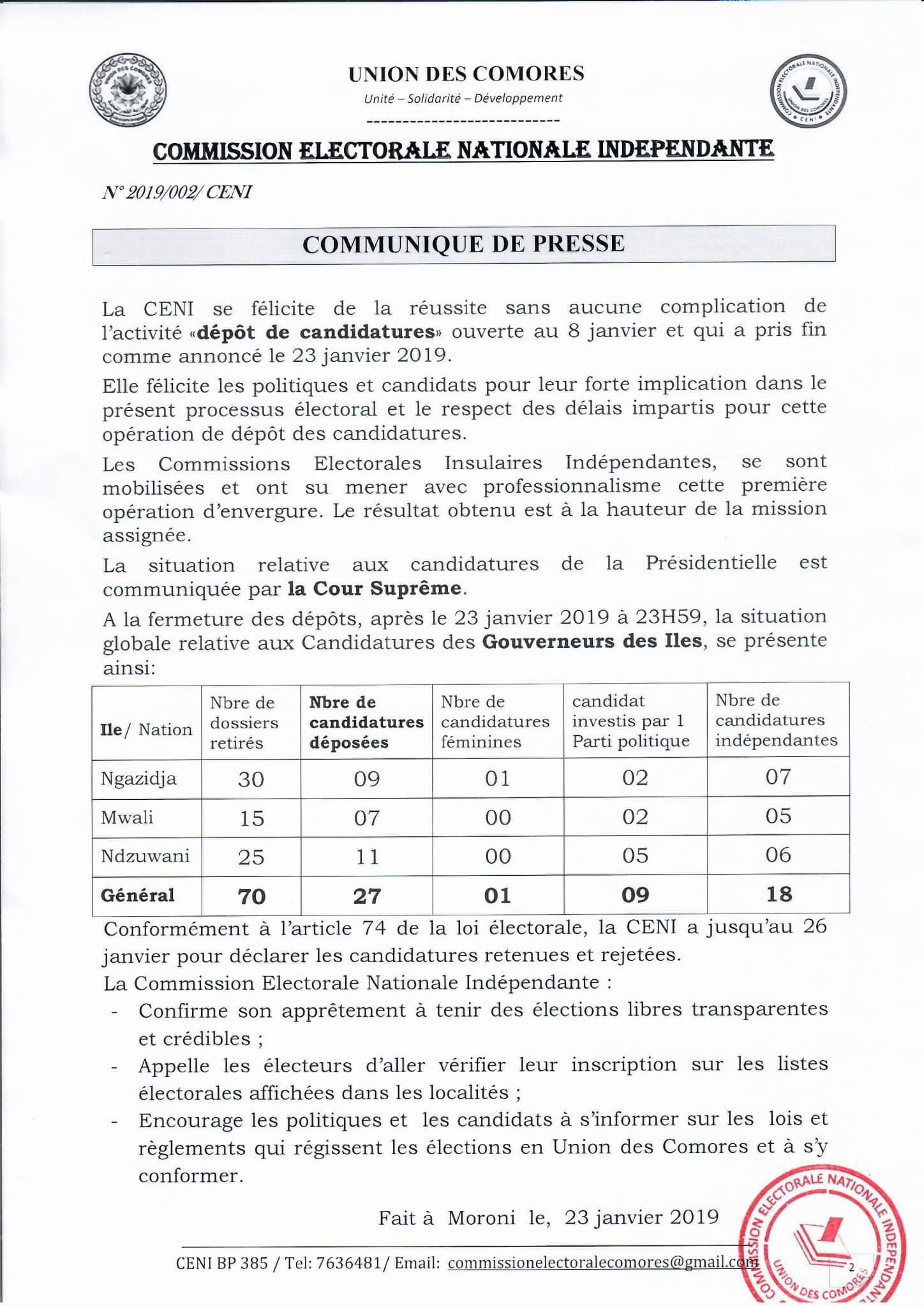 Il faudra rappeler que seule la Cour Suprême (CP) donnera la liste définitive des candidats retenus pour la course des gouvernorats des îles autonomes. Elle est également l'instance compétente ayant la légitimité de communiquer la situation relative aux candidatures des élections présidentielles.
