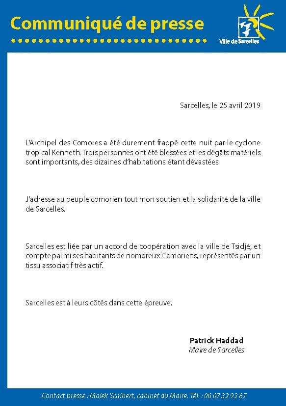 Le jeune maire de la ville de Sarcelles (95) en région parisienne , Patrick Haddad, a adressé ce jeudi une lettre de soutien au peuple comorien suite au cyclone Kenneth qui a frappé l'ensemble de l'archipel et ayant causé des pertes humaines et matériels.