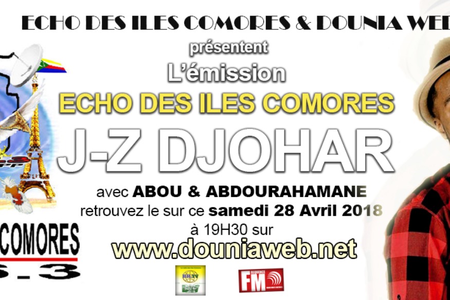 Nous recevons l'artiste JZ DJOHAR dans l'émission Echo des Iles Comores avec Abdourahamane & Abou. Le Samedi 28 Avril 2018 à 19H30 sur RFPP 106.3 FM et Sur Dounia Web.