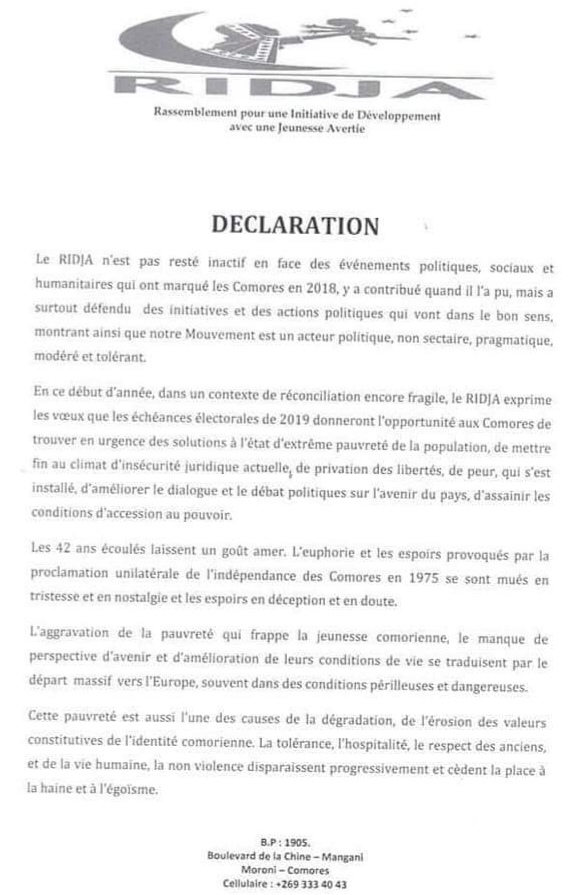 À l'occasion de la présentation des vœux pour la nouvelle année 2019, le président du parti Ridja a montré un court bilan de l'année écoulée et sa volonté de soutenir le président de la République sur son souhait de conjuguer les Comores dans les railles de l'émergence à l'horizon de 2030.