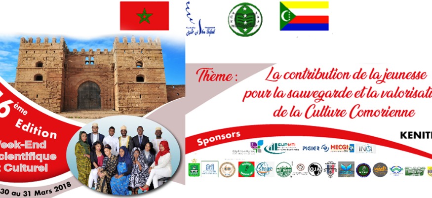L'association des Comoriens Etudiant au Maroc (A.C.E.M) vous présente le Week end Scientifique et Culturel de l'étudiant Comorien au Maroc Le 16eme édition sous le thème " Contribution de la jeunesse pour la sauvegarde et la valorisation de la culture comorienne". Elle se déroule à Kénitra ( Maroc) du 31 Mars à 01 avril 2018.
