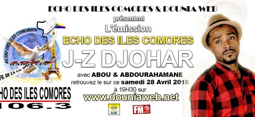 Nous recevons l'artiste JZ DJOHAR dans l'émission Echo des Iles Comores avec Abdourahamane & Abou. Le Samedi 28 Avril 2018 à 19H30 sur RFPP 106.3 FM et Sur Dounia Web.